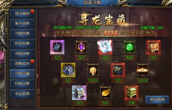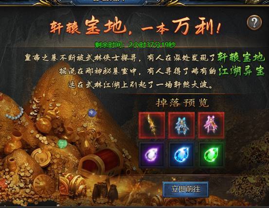 活动期间举行的全服挖宝活动,挖宝奖池进度全服共享,其中可产出护体神盾、龙象般若功等极其稀有的奖励。挖宝100次可获得“轩辕霸主”,获得进入轩辕主殿的资格。