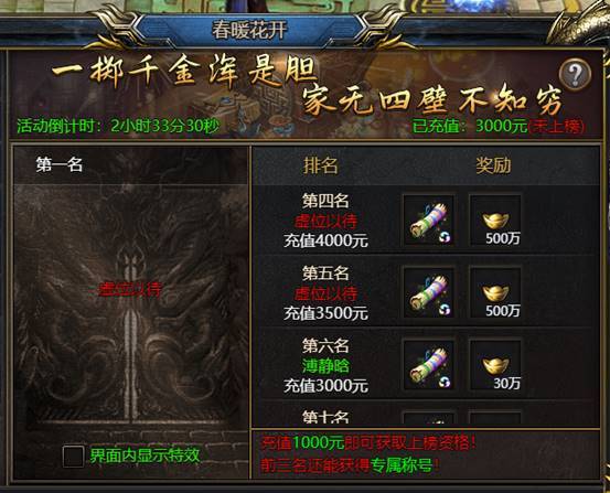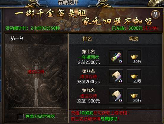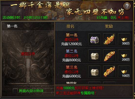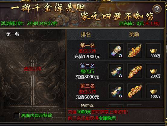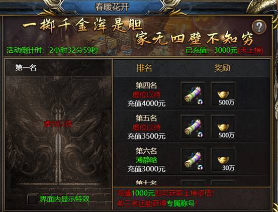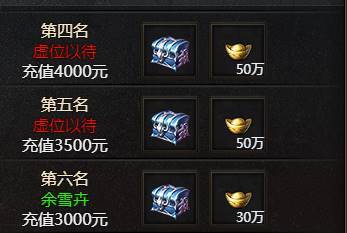 如第三名要求充值6000元,则充值5000元无法上榜第三以及更高的名次。