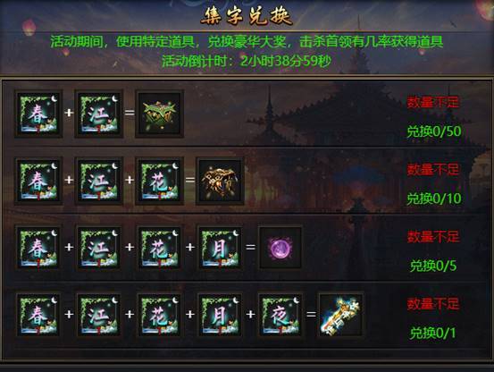 活动期间,195级以上怪物有概率掉落“春”“江”“花”“月”“夜”五个字,集齐不同的字可以再活动页面兑换各种奖励,还有限时称号!