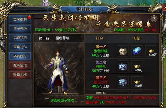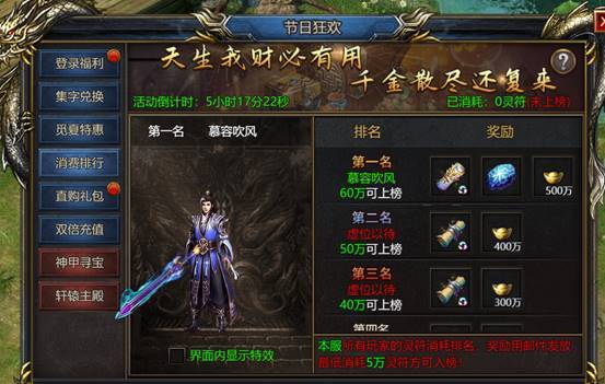 活动期间消费灵符可以参加排行榜,满足条件即可上榜,并维持名次至活动结束。第二天会通过邮件发放排行名次奖励。