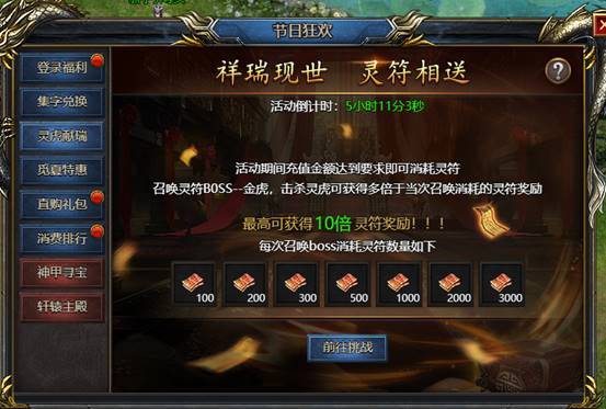 活动期间,充值指定数额可以获得挑战灵虎次数。进入活动地图,花费灵符,消耗次数,召唤灵虎。