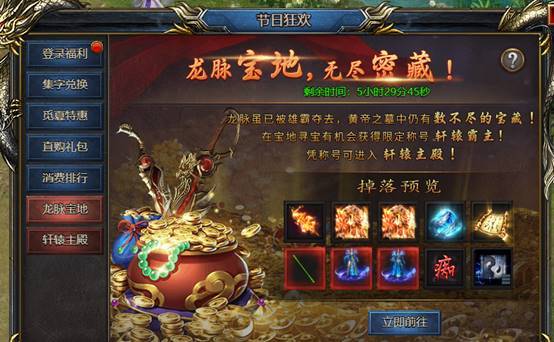 进入龙脉宝地挖宝,获得稀有装备。挖宝至100次时可以获得【轩辕霸主】称号,激活称号可以进入轩辕主殿,里面可以爆出稀有的江湖异宝。